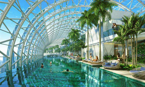 重慶來福士廣場位于兩江交匯處,本作“近水而樂水”項目內(nèi)水體景觀和游泳場館多達20多項,其中最具代表性的是位于“重慶之帆”上,由我司參與的打造的空中無邊際游泳池景觀。
