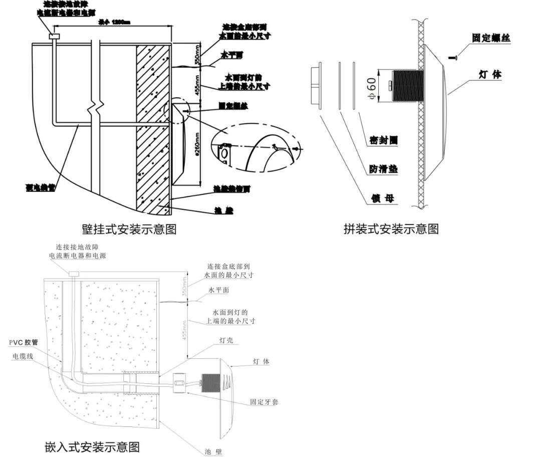 ??嵌入式水下燈由燈體和嵌入式燈殼組成,泳池池壁在安裝水下燈前,需要提前設(shè)計(jì)好水下燈安裝孔位并預(yù)留孔位,才能夠順利安裝完成。嵌入式水下燈的整體結(jié)構(gòu)決定了其良好的密封性能,并提供了更好的防水和安全性能,且因?yàn)槌乇谕怀雒嫘。O(shè)計(jì)上更美觀。
